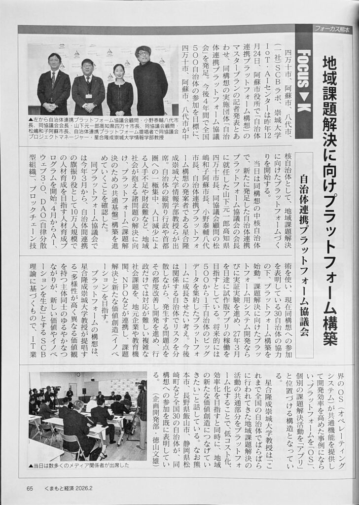 くまもと経済2026年2月号に,自治体連携プラットフォーム構築事業の記者会見のレポートが掲載されました.